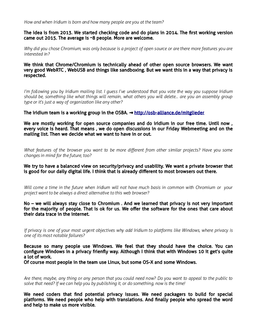 R: Necesitamos escritores de código que encuentren posibles problemas de privacidad. Necesitamos empaquetadores para que compilen para plataformas especiales. Necesitamos gente que ayude con las traducciones. Y, finalmente, gente que difunda la noticia (de que Iridium existe) y nos ayude a ser más visibles.