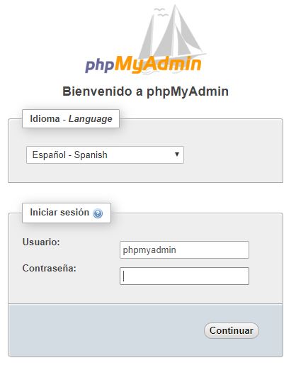 Una vez hecho esto debemos acceder vía web sin problemas, escribiendo la URL correspondiente: http://nombre-del-servidor-o-ip/phpmyadmin