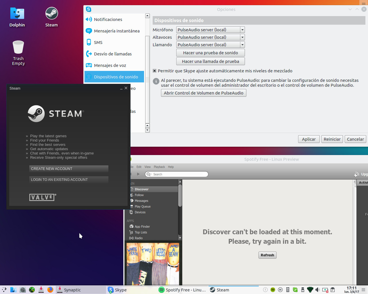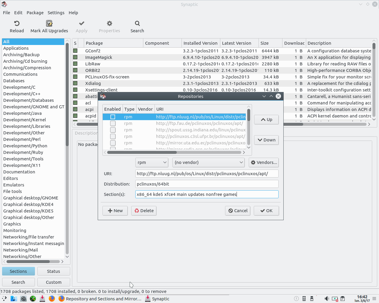 Hay que tener en cuenta que, al igual que Debian solo trae activada de serie la rama «main» de los repositorios, en esta distribución ocurre lo propio con tres secciones, diga lo que diga el correspondiente artículo de la wiki. En mi instalación de PCLinuxOS únicamente figuraban las secciones x86_64, kde5 y xfce4, por lo que cualquier búsqueda de software más o menos común resultaba en una tremenda frustración y extrañeza. Una vez añadamos el resto de ramas (updates, nonfree, games…) todo vuelve a lo que debería ser normal en cualquier distro, encontrando aplicaciones como Spotify, Skype (ambas privativas, os recuerdo) o Kodi. Hay que tener en cuenta que si no deseamos instalar software que no sea libre es preceptivo no habilitar la rama nonfree. Me parece un aspecto de vital importancia que no está correctamente reflejado en un lugar visible de la web del proyecto. Puede hacer que el más pintado se tire de los pelos (y acabe calvo) mientras busca el modo de instalar programas en PCLinuxOS.