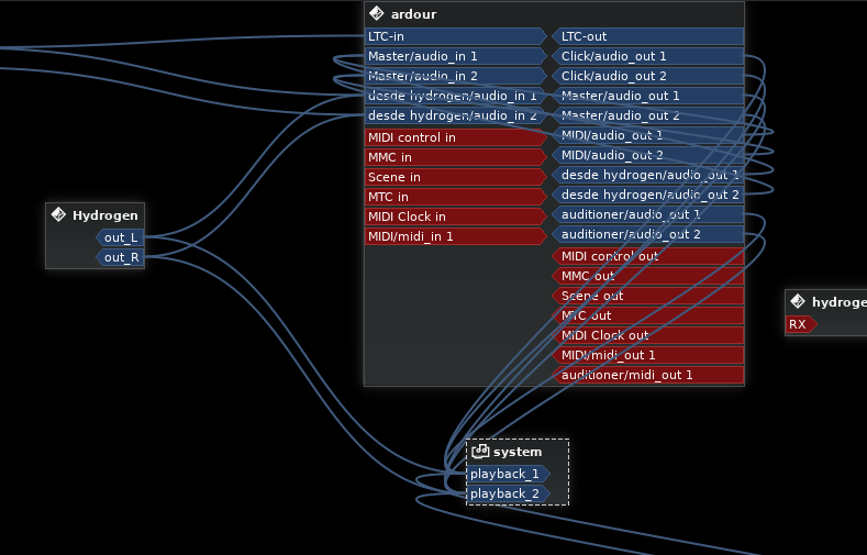 En la imagen de abajo se muestran en Catia las conexiones que tenemos establecidas; observa cómo salen de Hydrogen sendas líneas hacia la tarjeta de sonido de salida y hacia la entrada de su pista correspondiente. Ya que hablamos de Catia, es conveniente mencionar que existen varias interfaces para gestionar los ruteos con JACK, además del gestor de conexiones de Ardour, como son el propio Catia, QjackCtl o Patchage. Podéis usar indistintamente cualquiera de ellas ya que todas tienen una funcionamiento muy similar.