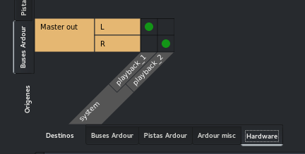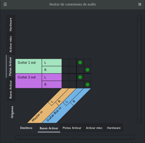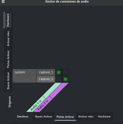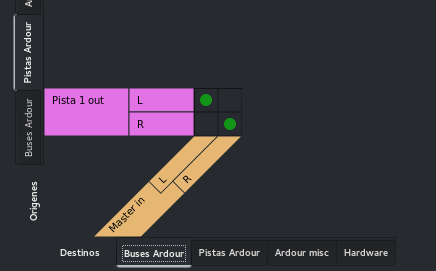 Vemos que ahora en orígenes estamos situadas en Pistas Ardour y en destinos estamos en Buses. Esta conexión es automática también salvo que hayamos especificado otra cosa en la configuración avanzada al crear la sesión.