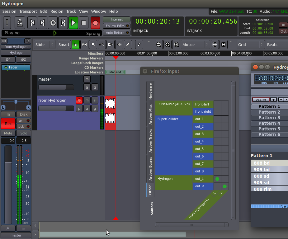 Ahora Ardour dirige los eventos de tiempo de Hydrogen. En cuanto empecemos a grabar pulsando play con la pista correctamente armada se empezará a reproducir y registrar el sonido de los patrones de la caja de ritmos. Observa en la imagen de abajo que las conexiones son similares a lo visto en el apartado anterior. La salida de Hydrogen aparecerá en la pestaña de orígenes/Other, y habría que enrutarlo a la entrada de la pista en la que queramos grabar.