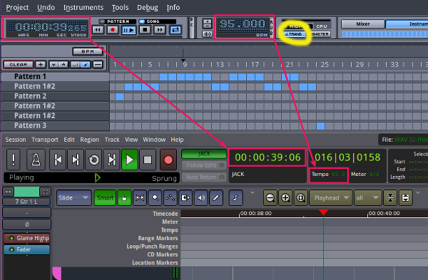 Para sincronizar Hydrogen y Ardour hay que marcar la opción de reloj JACK en ambos programas, para que los dos registren los eventos de tiempo a través del kit de conexión. En Hydrogen tenemos que activar transporte JACK en el botón marcado en amarillo y en Ardour tenemos esa opción en los botones de al lado del reloj primario; en la siguiente captura de pantalla está marcado en verde. Asegúrate que dentro de la configuración de Hydrogen estás usando JACK como controlador. Fíjate que ambos programas comparten la posición del cursor y el BPM.