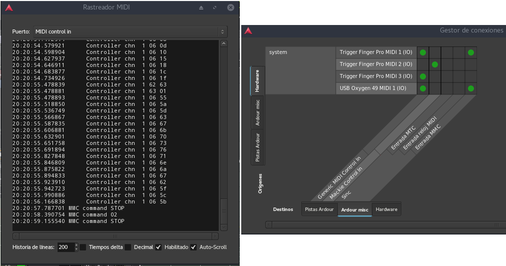 Si nuestro controlador tiene varias salidas de control como sucede con mi pad que tiene 3 posibles salidas, y queremos saber qué hace cada una de ellas tendremos que abrir el Rastreador MIDI (se puede ver en la imagen de arriba) e ir realizando conexiones para comprobar cuándo está Ardour recibiendo esos datos al accionar los controles. A modo de curiosidad os diré que en mi Trigger Finger la salida MIDI 1 incluye los pads, los botones de transporte y los 4 knobs, MIDI 2 asigna la cruceta y MIDI 3 asigna los 4 faders.