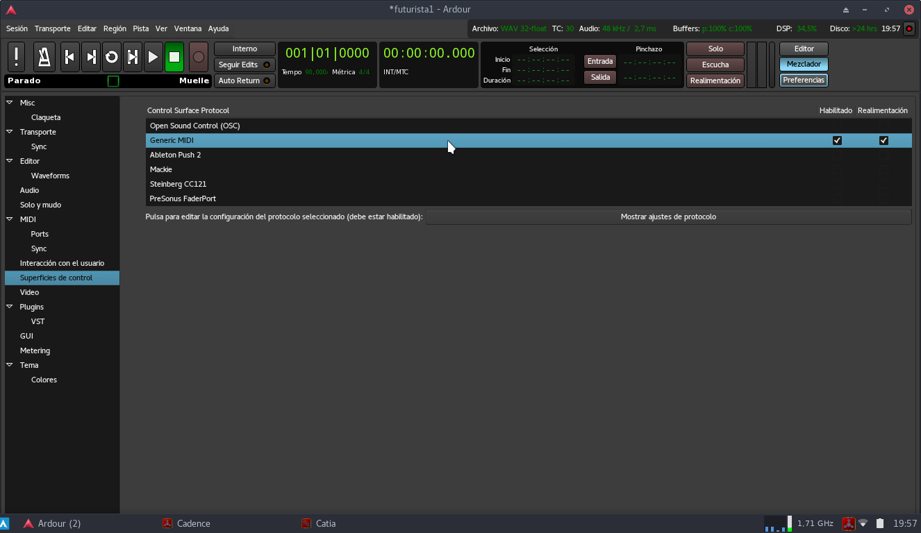 Además de introducir notas en la pista deseada con nuestro controlador MIDI, podemos realizar también otras funciones dentro de Ardour como manejar los botones de transporte, faders o knobs con los controles físicos de nuestro periférico. Para esto debemos irnos a la pestaña Preferencias/Superficies de control y seleccionar el aparato que vamos a usar; si tu cacharro no sale en la lista selecciona simplemente Generic MIDI. Es necesario que activemos “Habiltado”. En el botón Mostrar ajustes de protocolo podremos seleccionar algunos mapeos específicos preconfigurados para algunos dispositivos. La lista completa y sus ficheros de mapeo predefinidos están disponibles en el repositorio de Github de Ardour.