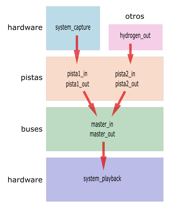 El enrutamiento básico tendría un esquema como este: el sonido se captura en nuestra interfaz de entrada (system_capture) y se enruta automáticamente hacia la entrada de las pistas; todas las salidas de las pistas van automáticamente a la entrada del máster; de la salida del máster se enruta a nuestra interfaz de salida (system_playback) que es a la que están conectados nuestros monitores.