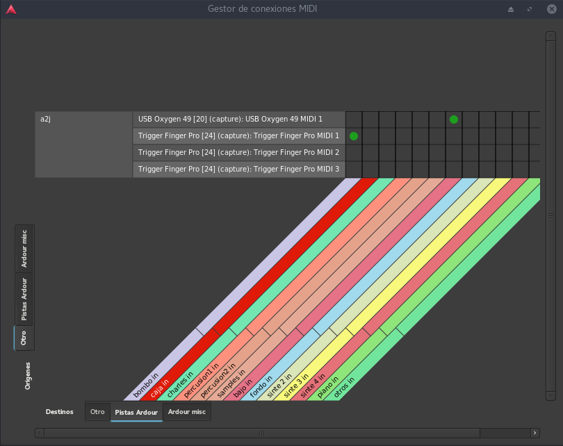 A continuación debemos configurar el enrutamiento. Nos situamos en el Gestor de conexiones MIDI dentro de la pestaña orígenes/Hardware y destinos/Ardour misc y asignamos las conexiones que necesitemos.