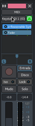 Ya hemos visto en una entrada anterior que si queremos usar un teclado MIDI o cualquier otro controlador para introducir notas, podemos seleccionarlo en el botón que tenemos en el mezclador para esa pista. En el caso de la captura de abajo usaríamos un Keystation. Recuerda que es conveniente activar y desactivar la entrada de MIDI cada vez que uses el controlador en una pista pulsando el botón verde con icono de clavija MIDI.